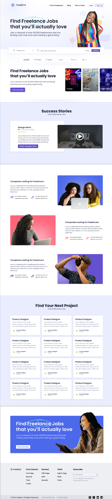 FreeBird is a website that addresses the challenge of effectively connecting businesses with freelance creatives.
